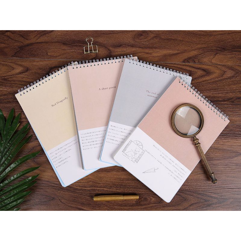 Buku notes seri Life Lyrics memiliki sampul minimalis berlatar warna pastel. Temukan halaman bergaris B5 di dalamnya yang cukup lapang untuk kebutuhan mencatat sehari-hari. Buku notepad ini dibuka ke atas dan dijilid spiral agar mudah dibuka lebar sekaligus kuat.