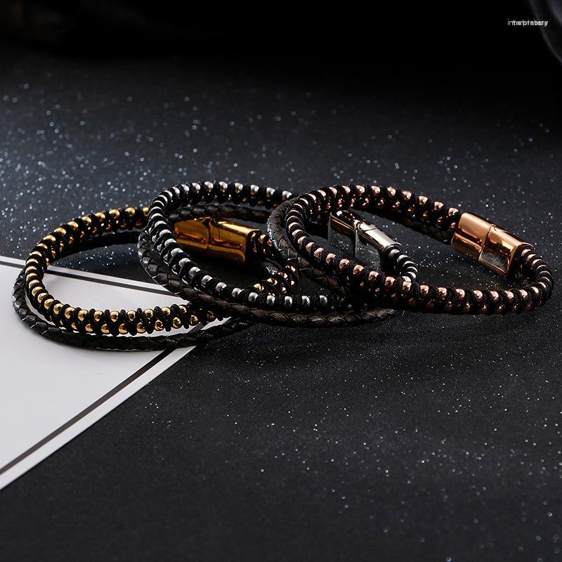 Link Bracelets Leather Rope Ball Men's Double Stainless Steel Braided Bracelet Hand-made Multilayer Jewelry
