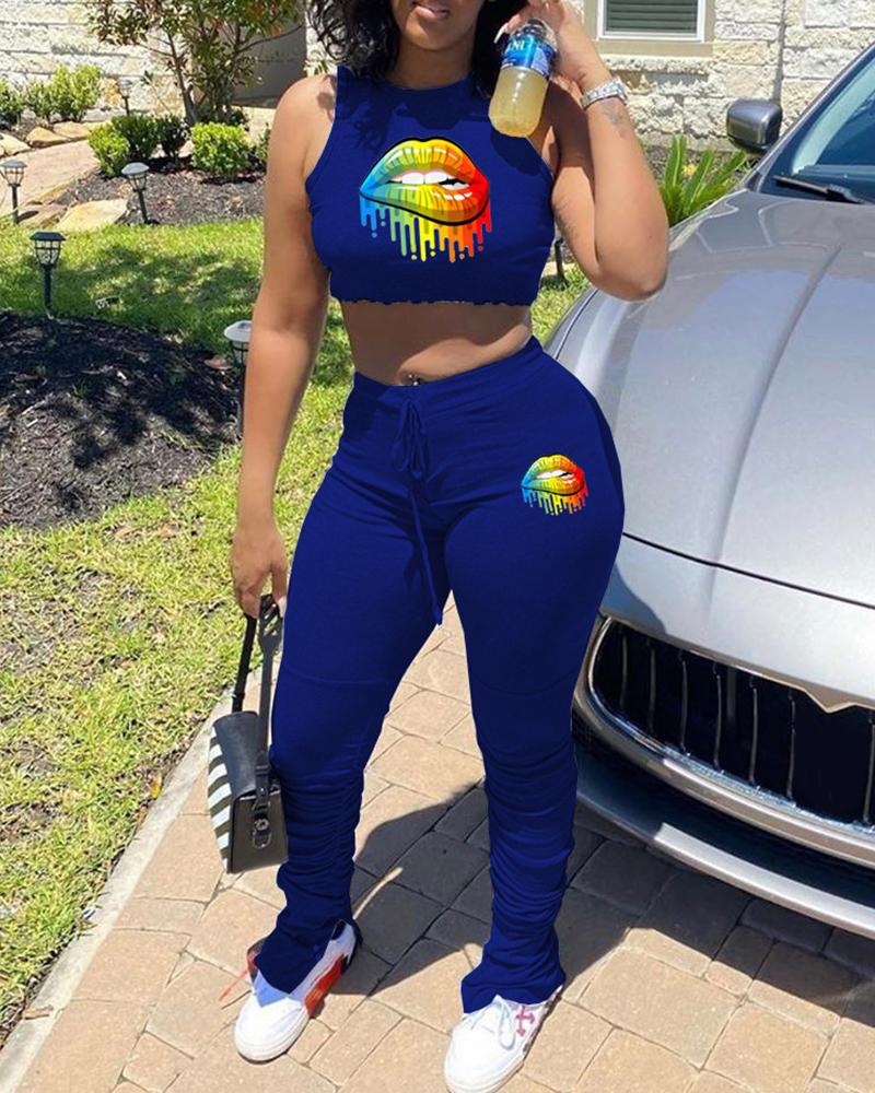 Lip Ink Splash Print Top & Drawstring Pants Set, Blue