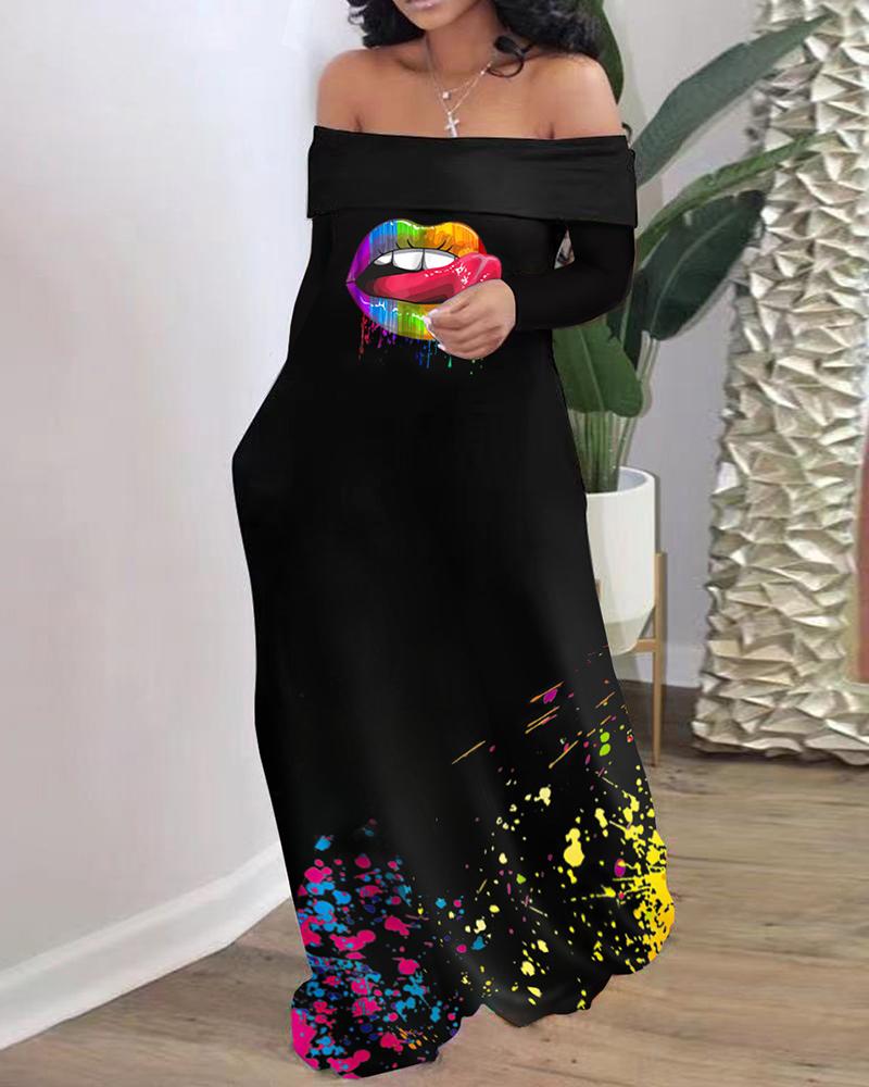 Lip Letter Print Ink Splash Off Shoulder Maxi Dress, Style3