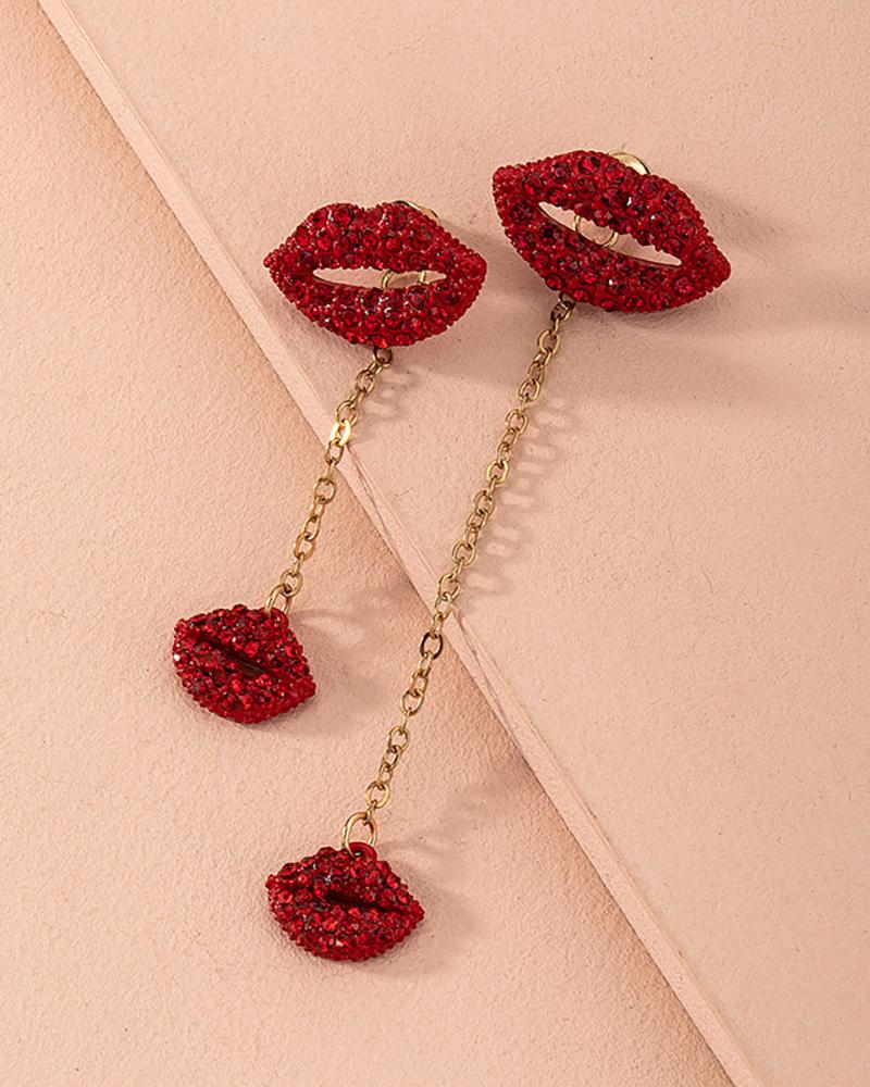 Lip Pattern Rhinestone Drop Earrings, Red
