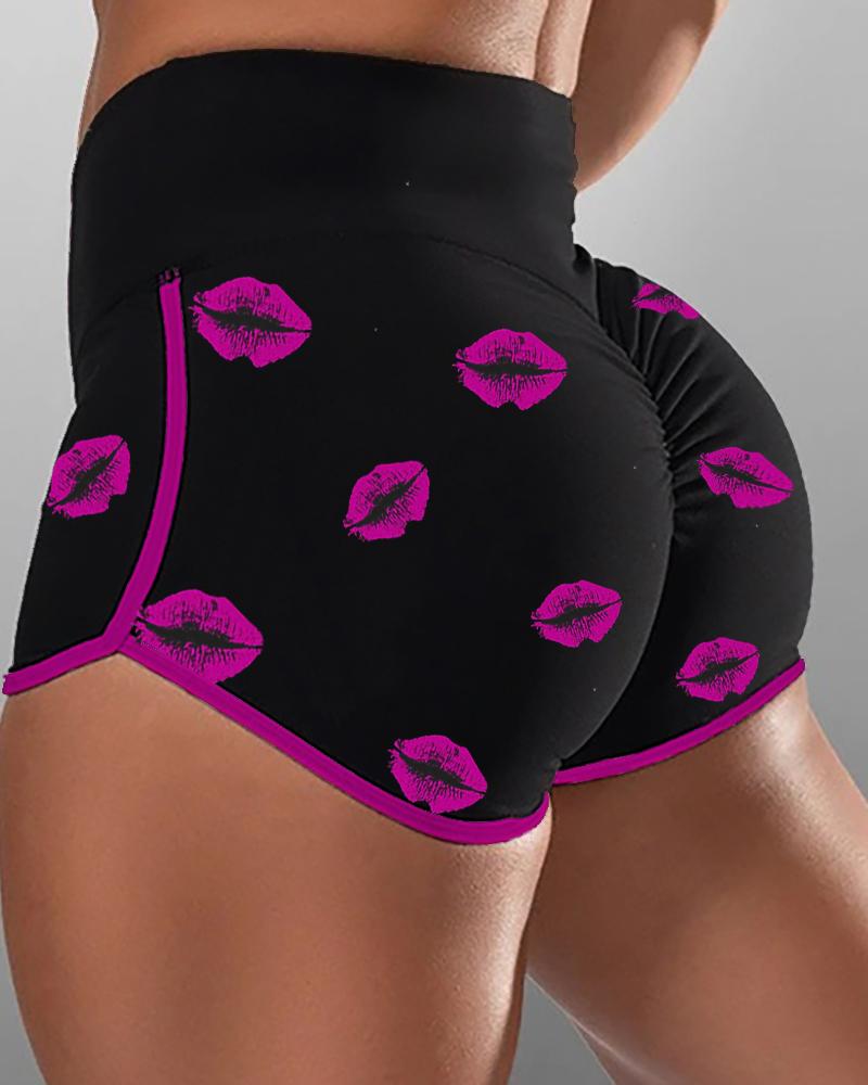 Lip Print Contrast Binding Yoga Shorts, Black