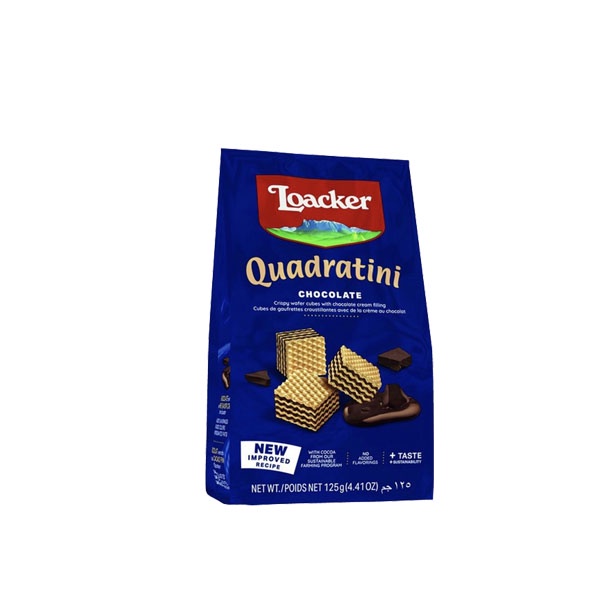 Loacker Quadratini Chocolate 125gr Bagi Anda penggemar wafer mungkin sudah tidak asing lagi dengan camilan Loacker Quadratini. Dimana, produk ini selalu menjadi pilihan tepat dengan varian rasa yang lezat dan renyah untuk dikonsumsi. Bahkan, Camilan yang memiliki tesktur renyah ini memiliki berbagai rasa seperti Cappucino, Napolitaner, Chocolate dan Dark Chocolate yang menjadikan wafer ini banyak disukai masyarakat. Apalagi, empat lapisan krim yang lembut membuat kelezatan wafer terasa nikmat disetiap gigitannya.