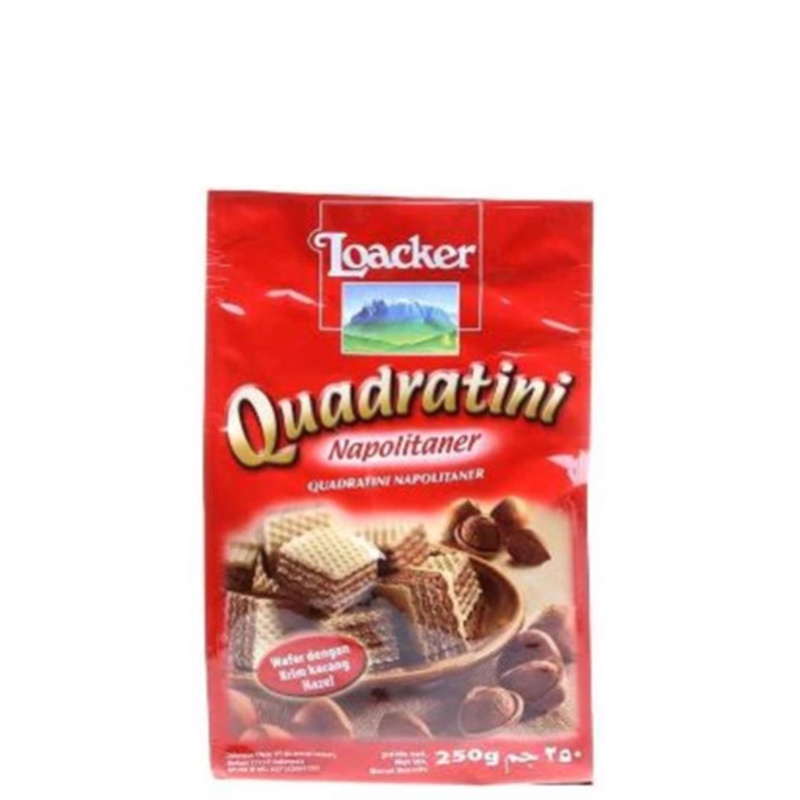 Loacker Quadratini Napolitan 250gr merupakan wafer dengan krim kacang hazelnut, Dengan komposisi 74% krim dalam setiap kepingnya, Tidak menggunakan pewarna & perasa buatan, lemak hidrogenasi, Tanpa bahan pengawet, dan kandungan GMO (Genetically Modified Organism) BPOM ML 236110275030,Shelf Life: 12 Bulan