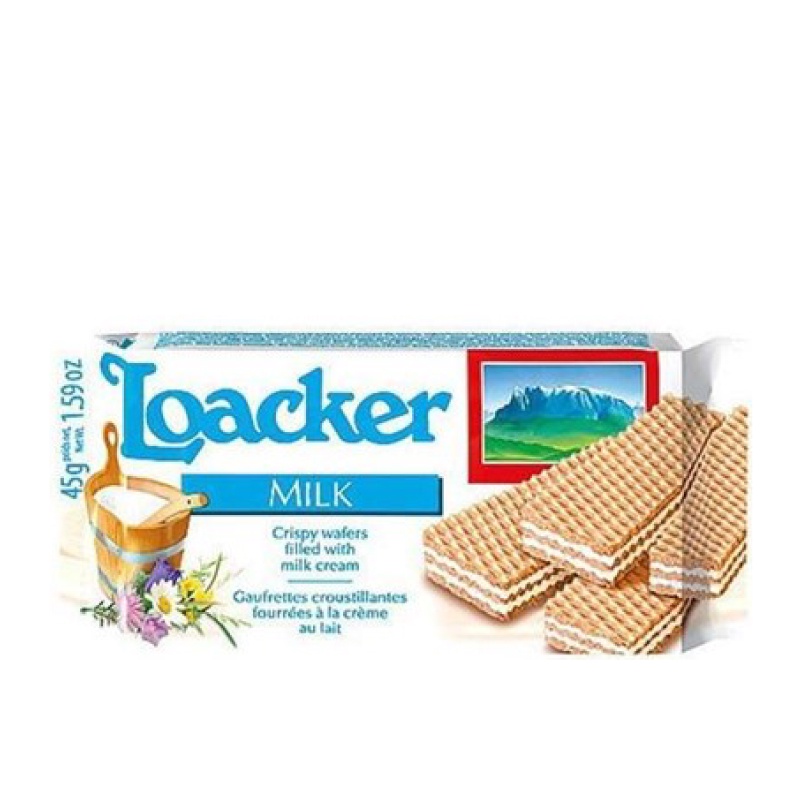 Loacker Milk Wafer 45 gr adalah wafer dengan Milk Cream, Dengan komposisi 74% krim dalam setiap kepingnya, Tidak menggunakan pewarna & perasa buatan, lemak hidrogenasi, Tanpa bahan pengawet, dan kandungan GMO (Genetically Modified Organism).