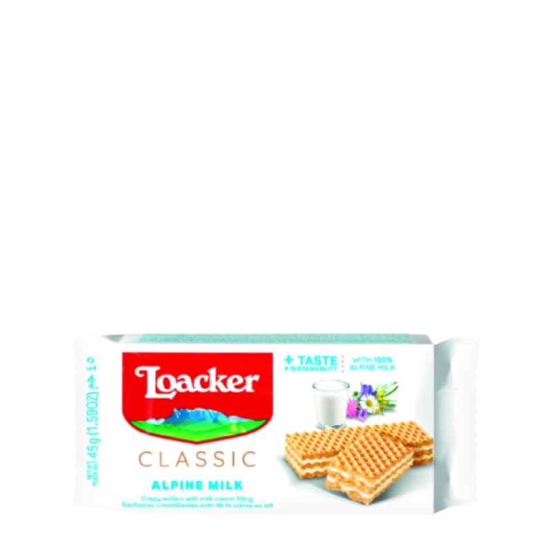 Loacker Milk Wafer 45 gr adalah wafer dengan Milk Cream, Dengan komposisi 74% krim dalam setiap kepingnya, Tidak menggunakan pewarna & perasa buatan, lemak hidrogenasi, Tanpa bahan pengawet, dan kandungan GMO (Genetically Modified Organism) BPOM ML 636110296030, Shelf Life: 12 Bulan