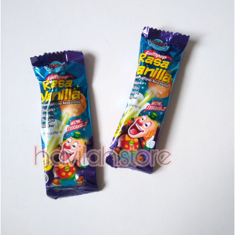 Lollipop rasa vanila, stik lollipop bisa menyala. 1 pak isi 20bj, netto 20x10g