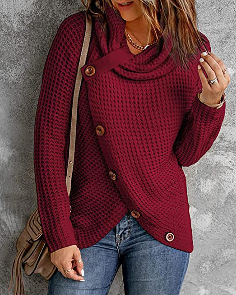 Long Sleeve Button Design Waffle Knit Sweater, Red