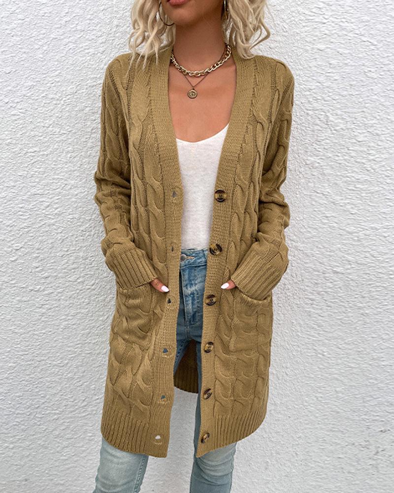 Long Sleeve Button Front Cable Knit Cardigan, Khaki