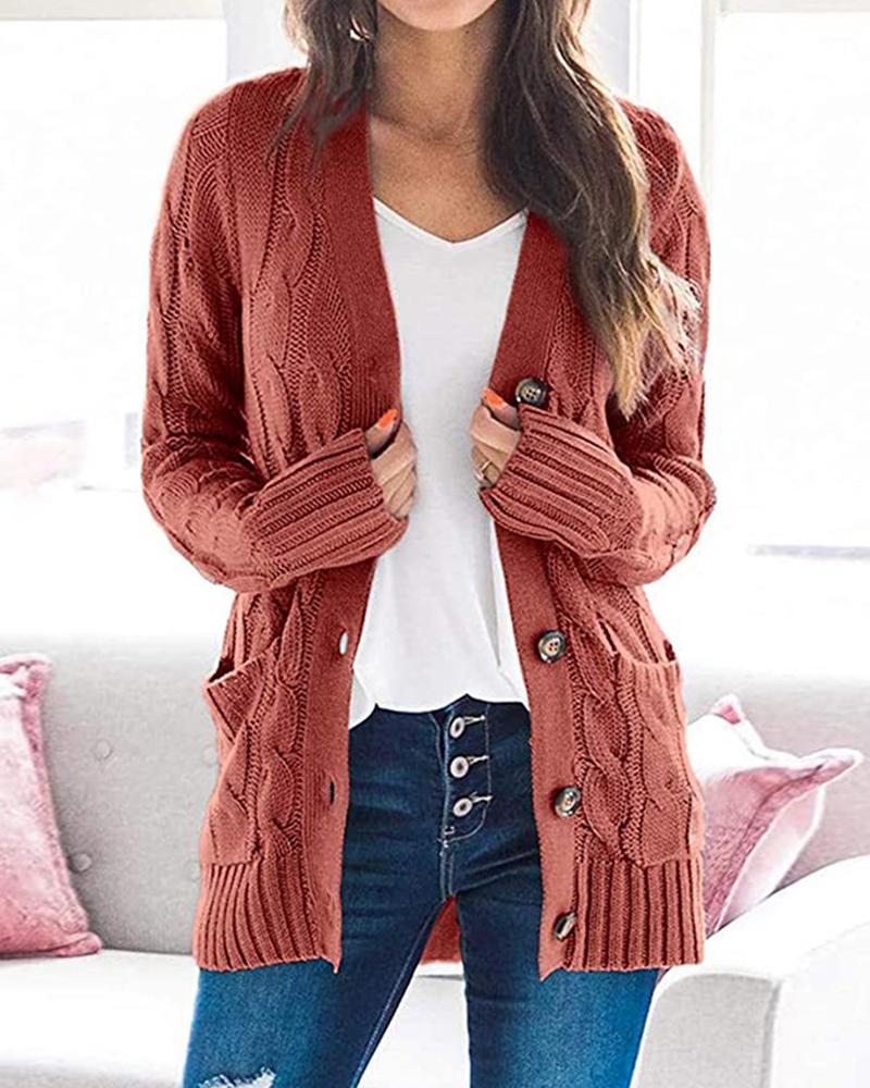 Long Sleeve Button Front Cable Knit Cardigan, Red