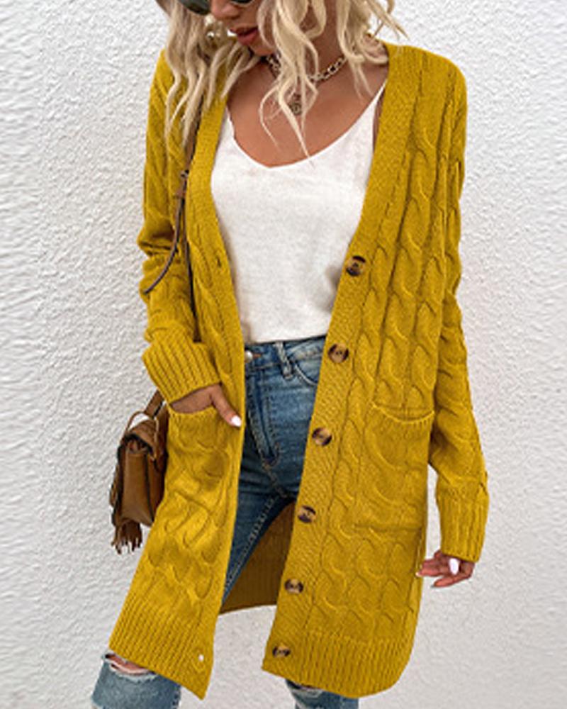 Long Sleeve Button Front Cable Knit Cardigan, Yellow