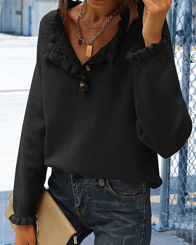Long Sleeve Button Front Ruffle Hem Knit Sweater, Black