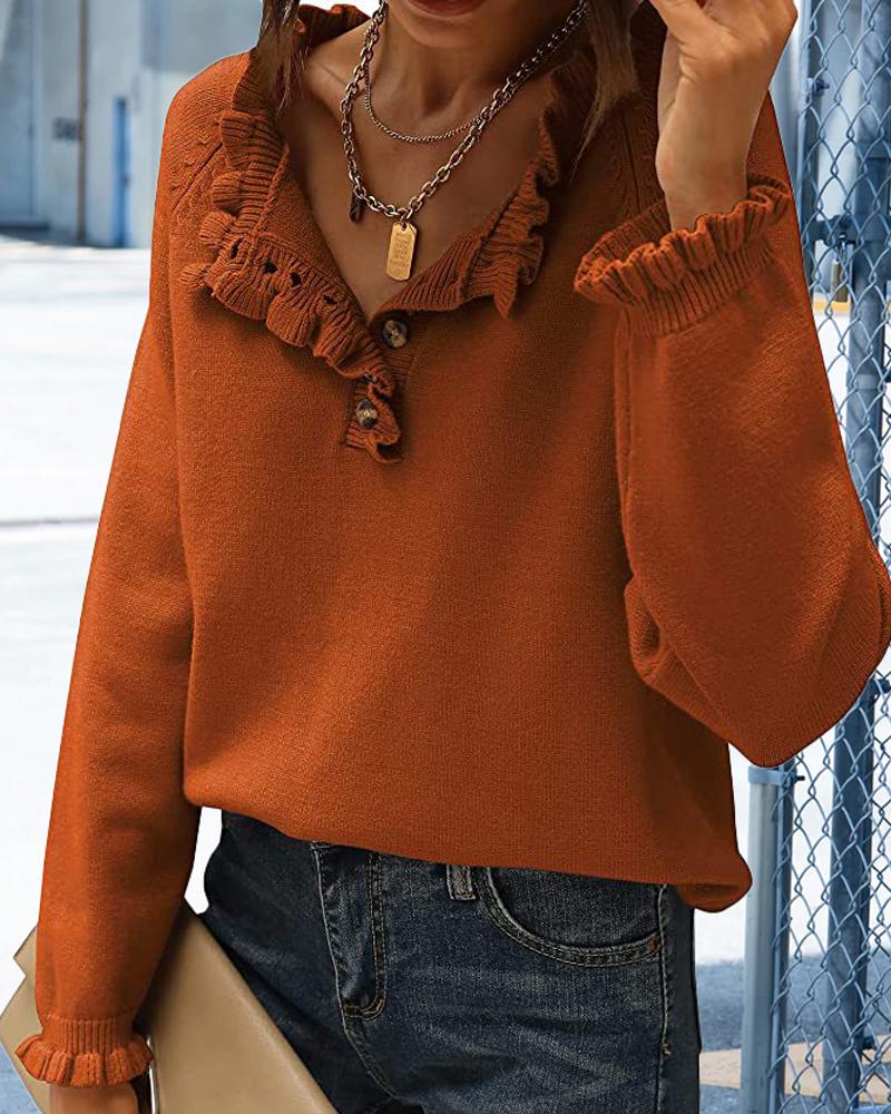 Long Sleeve Button Front Ruffle Hem Knit Sweater, Orange