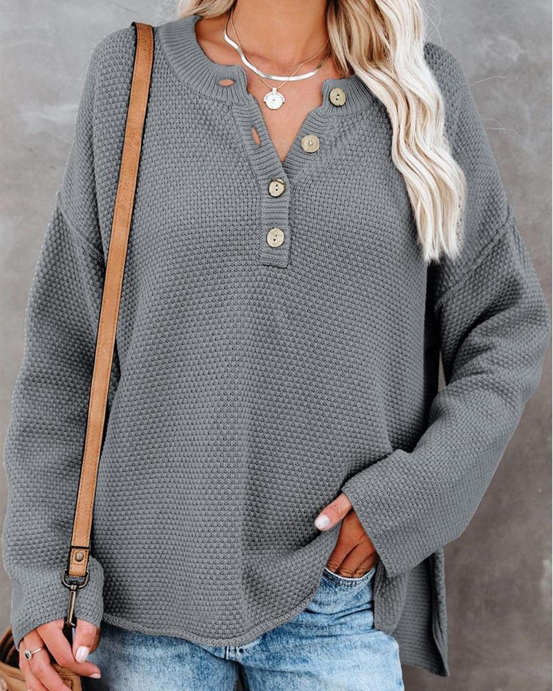Long Sleeve Button Front Split Hem Sweater, Gray