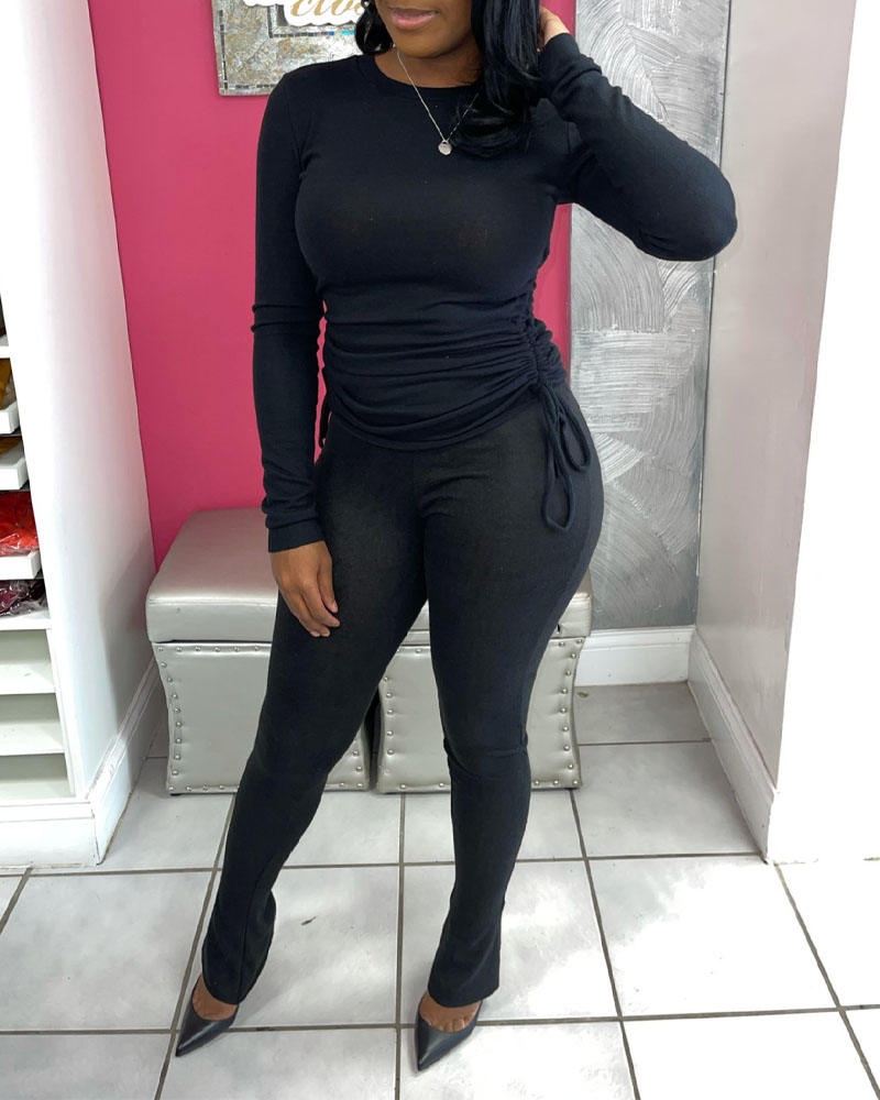 Long Sleeve Drawstring Ruched Top & Bootcut Pants Set, Black