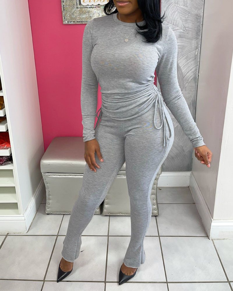 Long Sleeve Drawstring Ruched Top & Bootcut Pants Set, Gray