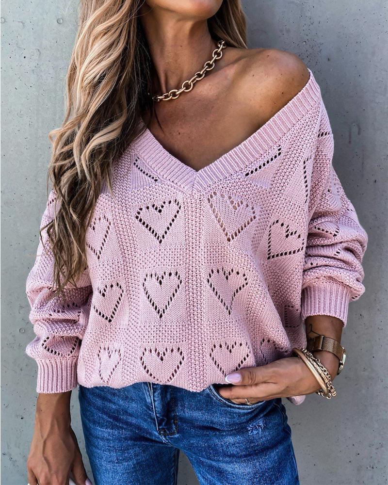 Long Sleeve Pointelle Knit Heart Pattern Sweater, Pink