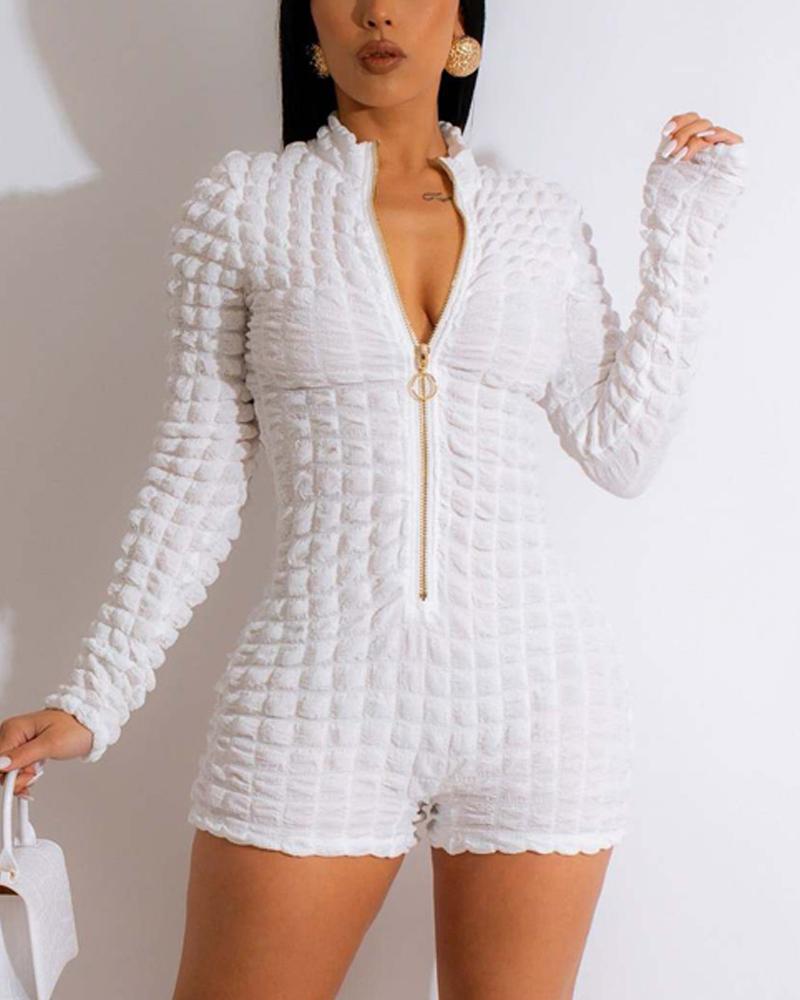 Long Sleeve Zip Front Textured Romper, White