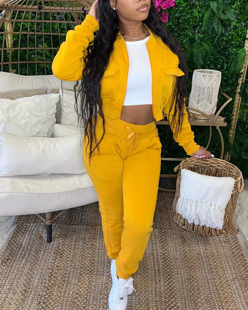 Long Sleeve Zip Up Top & Drawstring Pants Set, Yellow