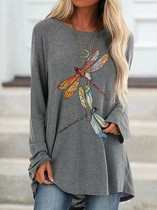 t-shirts,loose dragonfly print round neck long sleeve t-shirt
