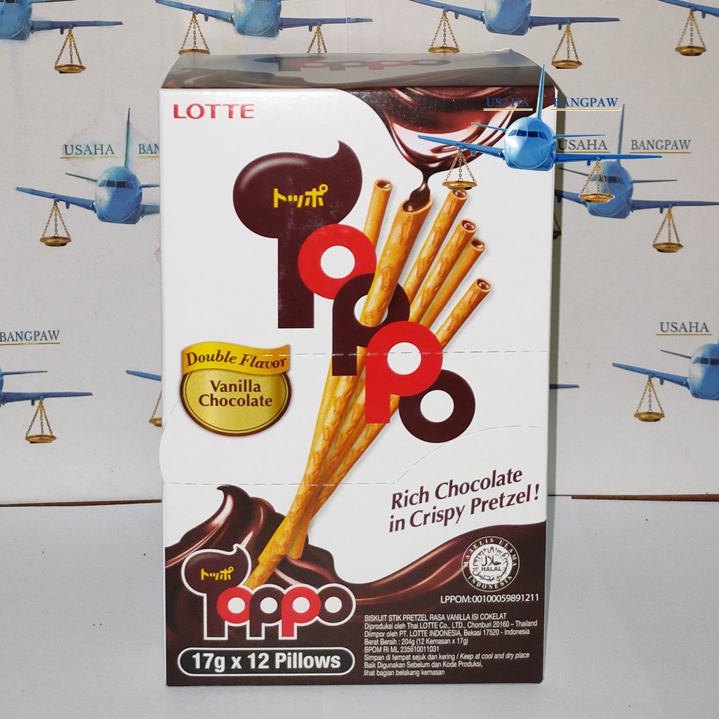 Biskuit stik pretzel rasa vanilla isi cokelat, double flavor vanilla chocolate rich chocolate in crispy pretzel.