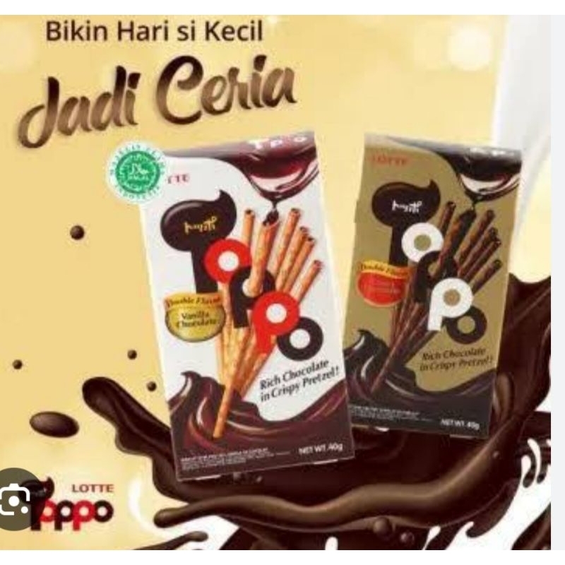 Lotte Toppo tersedia 2 varoan Vanila Chocolate dan double coklat, cemilan Biskuit stik rasa vanila isi cokelat dan double coklat ,,di jual per 1 kotak isi 12 bungkus....yuk di order