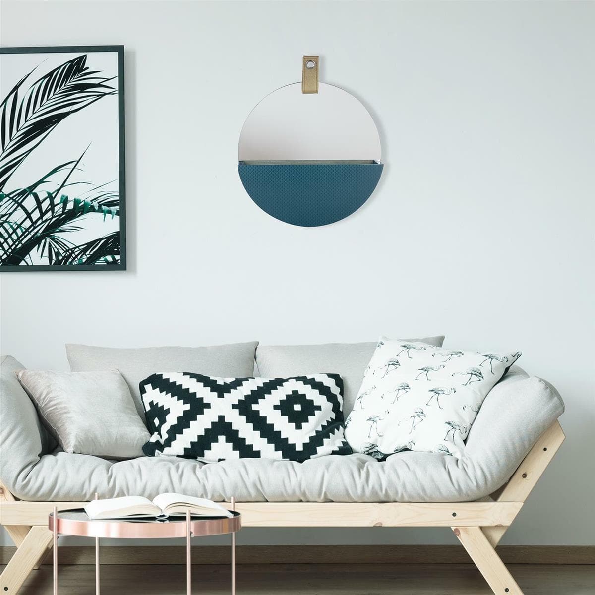 Okrągłe lustro Rangement pomoże w zorganizowaniu przestrzeni przedpokoju. Dzięki głębokiej i pojemnej półce lustro jest bardzo praktyczne. Jasnoniebieska półka w kształcie półokręgu dodaje nowoczesnego wyglądu oraz współgra z jasnobeżowym uchwytem.