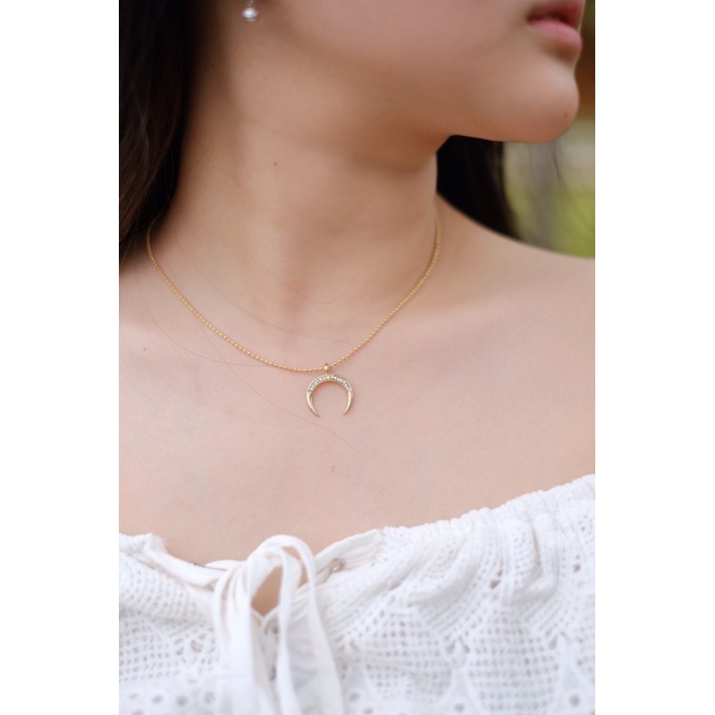 a crescent moon shaped necklace with a hint of silver shimmer to it , and a golden lining which gives it a more edgier look