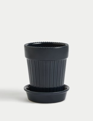 M&S Collection Medium Ridged Ceramic Planter with Tray - Blue, Blue