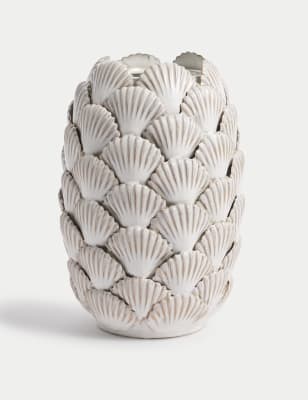 Bring a touch of the seaside to your home with this statement vase, featuring a textured shell design. The medium-sized piece is crafted from durable ceramic with a timeless glazed finish. Each shell is shaped and applied by hand.