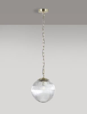 Inspired by Art Deco designs, this ceiling pendant light makes for an elegant focal point. The large globe shade is made from ribbed glass to diffuse the light and complements the ceiling rose and long gold-tone metal chain.
