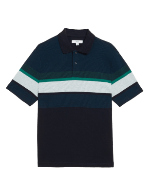 Keep it casual with this pure cotton polo shirt. Regular fit cut, with a classic collared neck and button-up fastening. Bold block stripe print across the chest. Made from heavyweight double knit fabric for warmth. We only ever use responsibly sourced cotton for our clothes.n M&S Collection: easy-to-wear wardrobe staples that combine classic and contemporary styles.