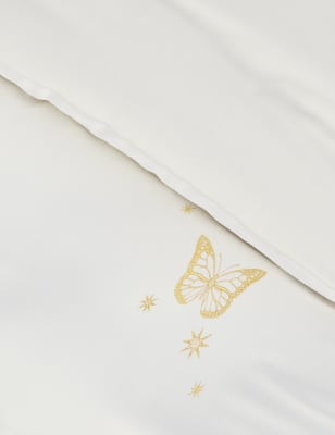 This pure cotton bedding set will bring a playful feel to your bedroom with its embroidered design of butterflies and dragonflies. Glittery strands in the embroidery thread add a touch of shimmer. The single size comes with one standard pillowcase. In the double, king and super king sets, you'll find two pillowcases.