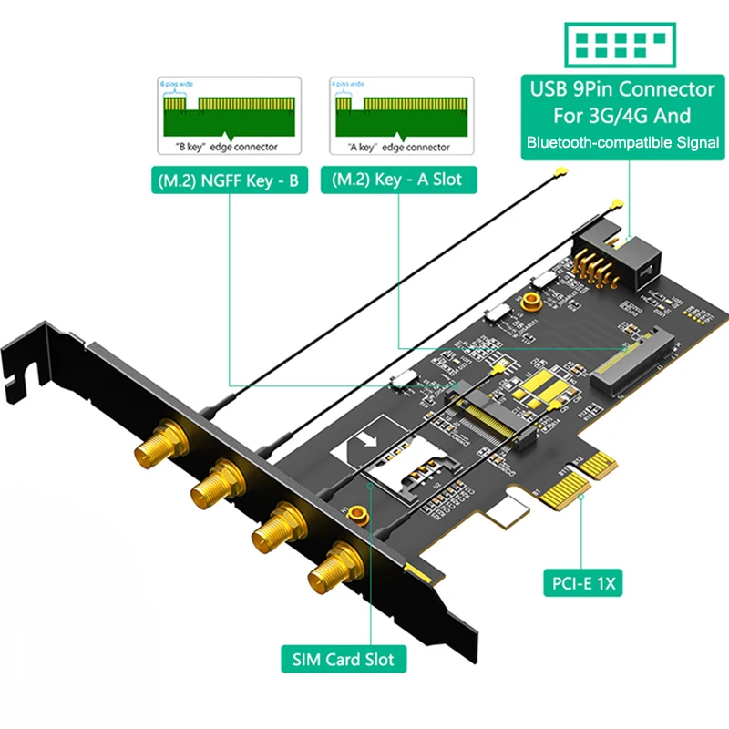 M.2 Key B 3G/4G Module + M.2 Key-A Wifi Card to PCI Express X1 Expansion Card SIM Slot 3G/4G Bluetooth-compatible Signal 9-Pin