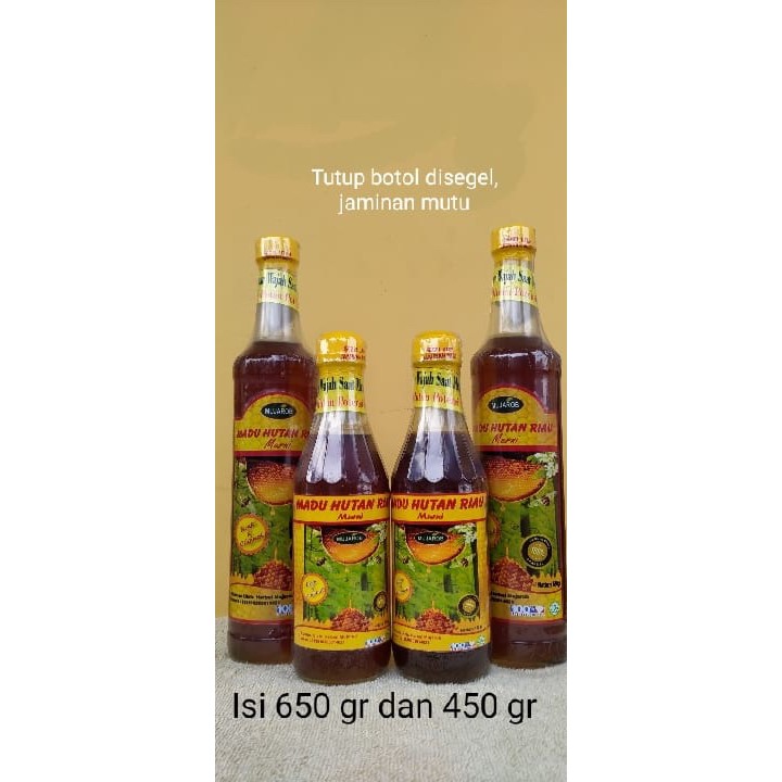Madu Hutan Riau Murni Mujarob, merupakan madu murni yang diolah melalui proses secara higienis dan diproduksi dalam dua bentuk kemasan, 650 gr dan 450 gr