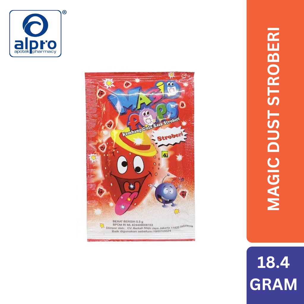 Magic Dust Strawberry 18.4g adalah permen bubuk dengan rasa stroberi yang unik, dikenal juga sebagai "popping candy" karena memberikan sensasi meletup-letup di mulut saat dikonsumsi. Produk ini populer di kalangan anak-anak dan remaja, serta sering dijadikan camilan nostalgia bagi banyak orang.