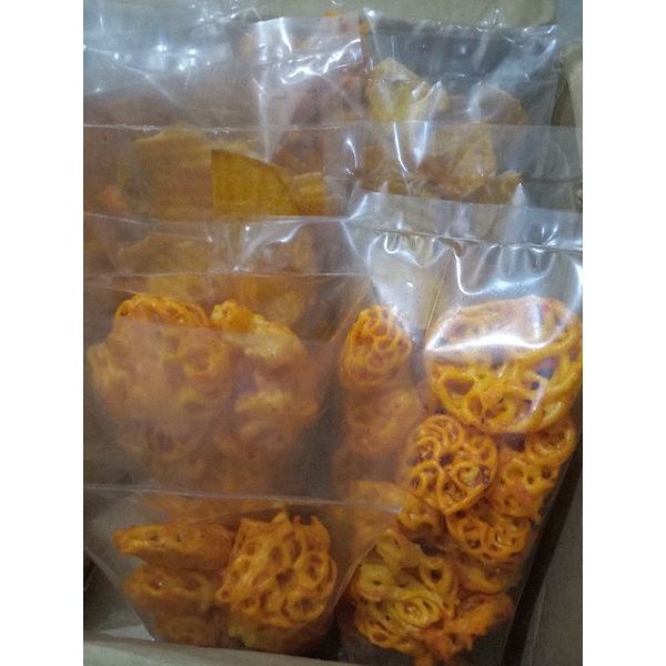 Cemilan terdiri dari seblak mawar, makaroni pipa, makaroni spiral, kripik kaca, talas geprek, baso goreng, cimol pedas, silahkan pilih di variasi..