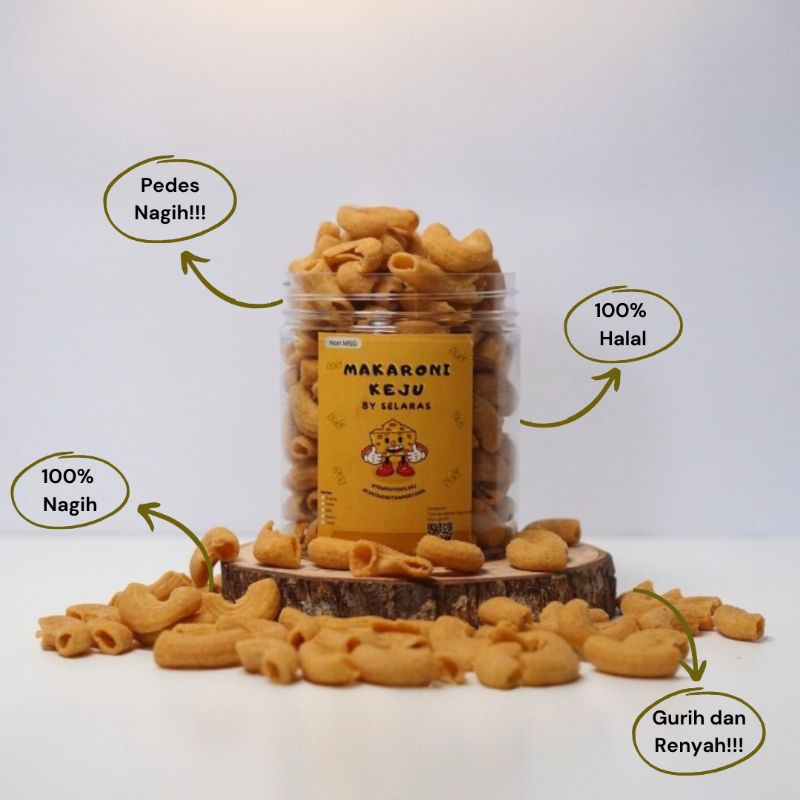 Makaroni Keju by Selaras hadir dengan rasa Pedas untuk memanjakan lidah Anda dengan rasa Pedas yang nagih, gurih, dan renyah ditambah dengan rasa Pedas yang bikin nagih di setiap gigitan. Cocok untuk ngemil santai atau teman nonton favorit Anda!
