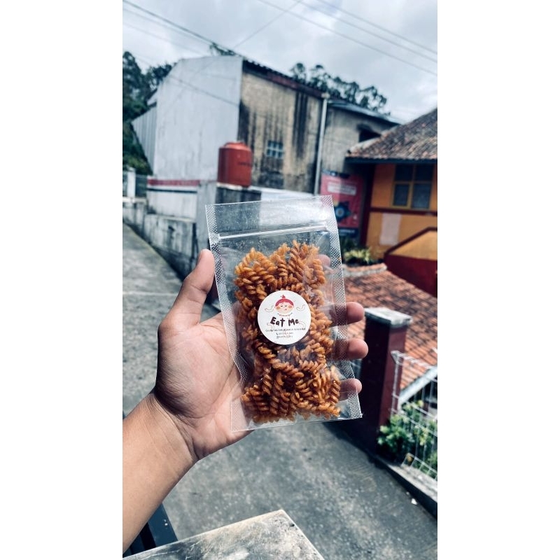 Makaroni Spiral renyah dan gurih dengan varian rasa Pedas Manis dan Pedas Gurih serta dengan aroma daun jeruk yang segar, Cocok dimakan dengan nasi hangat