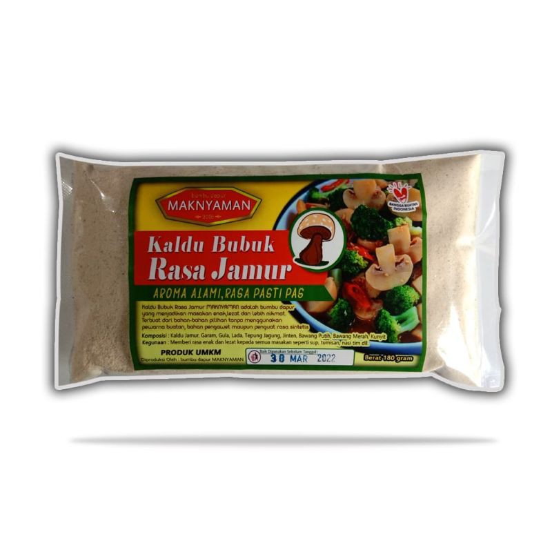 MAKNYAMAN kaldu bubuk rasa jamur adalah bumbu dapur yang menjadikan masakan enak, lezat, dan lebih nikmat. terbuat dari bahan bahan pilihan tanpa menggunakan pewarna buatan, bahan pengawet maupun penguat rasa sintesis
