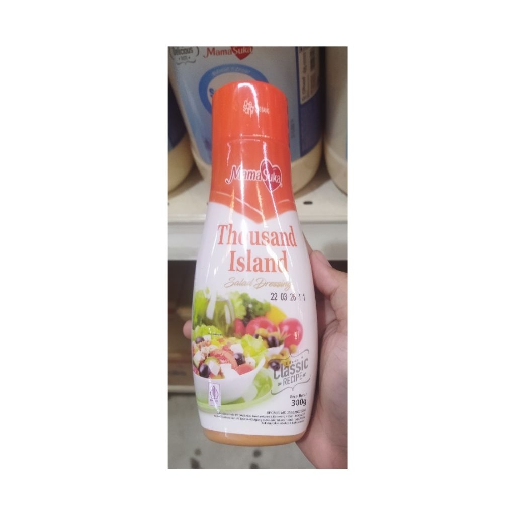 Thousand Island MamaSuka merupakan salah satu jenis salad dressing dengan bahan dasar mayonnaise ditambah tomat segar serta acar, dan bahan lainnya. Cocok untuk berbagai macam jenis salad sayur atau buah untuk menambah rasa dan kesegaran.