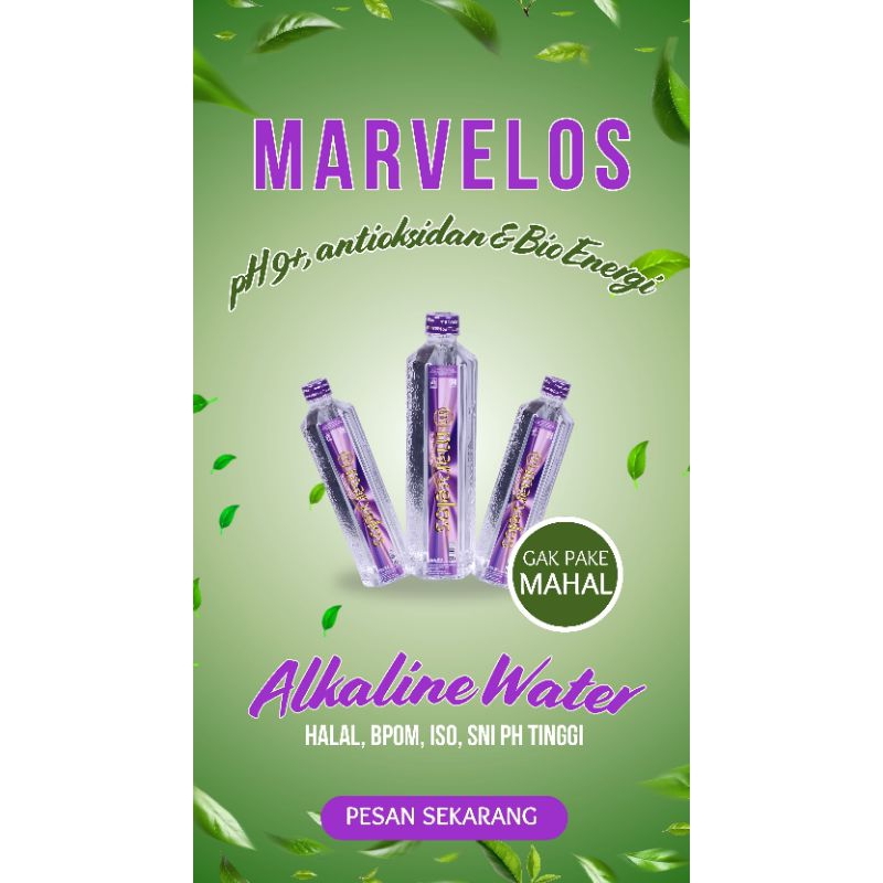 *Marvelos* adalah *air minum PH TINGGI alami* dari pegunungan Garut, Jawa BARAT, dengan kandungan sbb :