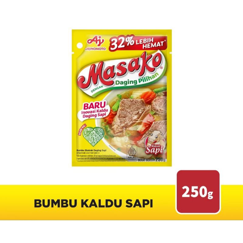 Masako bumbu extra daging sapi dibuat dengan daging sapi pilihan yang berkualitas serta kombinasi bumbu dan rempah pilihan. Menghasilkan rasa kaldu yang lezat seperti kaldu buatan sendiri di rumah , untuk masakan sehari-hari dengan sangat mudah dan praktis.