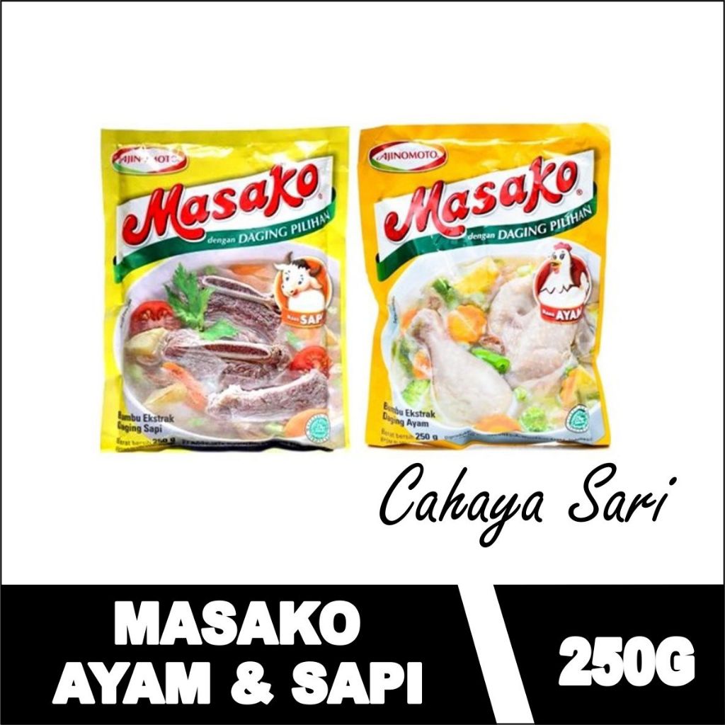 Masako bumbu ekstrak daging sapi/ayam, dibuat dengan daging sapi/ayam yang berkualitas serta kombinasi bumbu dan rempah pilihan. Menghasilkan rasa kaldu yang lezat, seperti kaldu buatan sendiri di rumah, untuk masakan sehari-hari dengan cara yang mudah dan praktis. Masako sajikan #KenikmatanHakiki untuk keluarga makanan jadi makin enak dan lezat, jadi pingin tambah lagi! Kandungan garam/ natrium 520 mg per sajian Sesuai dengan angka kecukupan gizi yang direkomendasikan yaitu