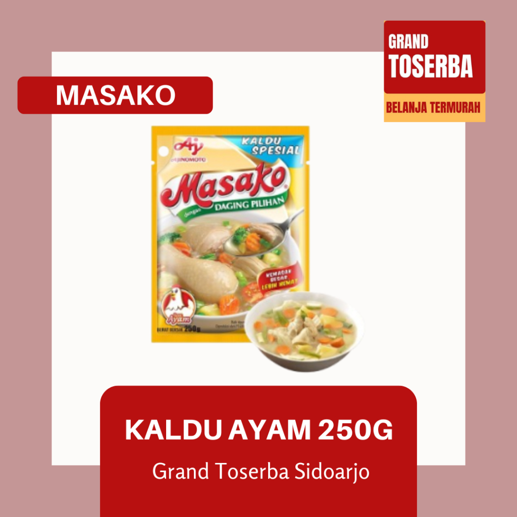 Masako ayam, sapi, dan jamur adalah bumbu kaldu penyedap yang terbuat dari daging segar, rempah, dan bumbu pilihan. Masako dapat digunakan untuk berbagai jenis masakan, seperti goreng, tumis, dan berkuah.