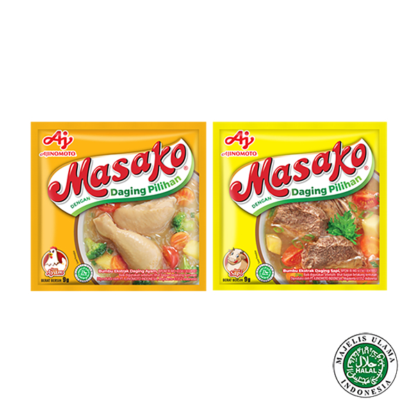 Masako, Bumbu Kaldu Penyedap dibuat dengan perpaduan sempurna antara daging segar berkualitas, bumbu dan rempah pilihan. Sehingga secara praktis menyempurnakan kelezatan masakan Anda sehari-hari dengan rasa dan aroma dari daging asli sama seperti kaldu buatan di rumah.