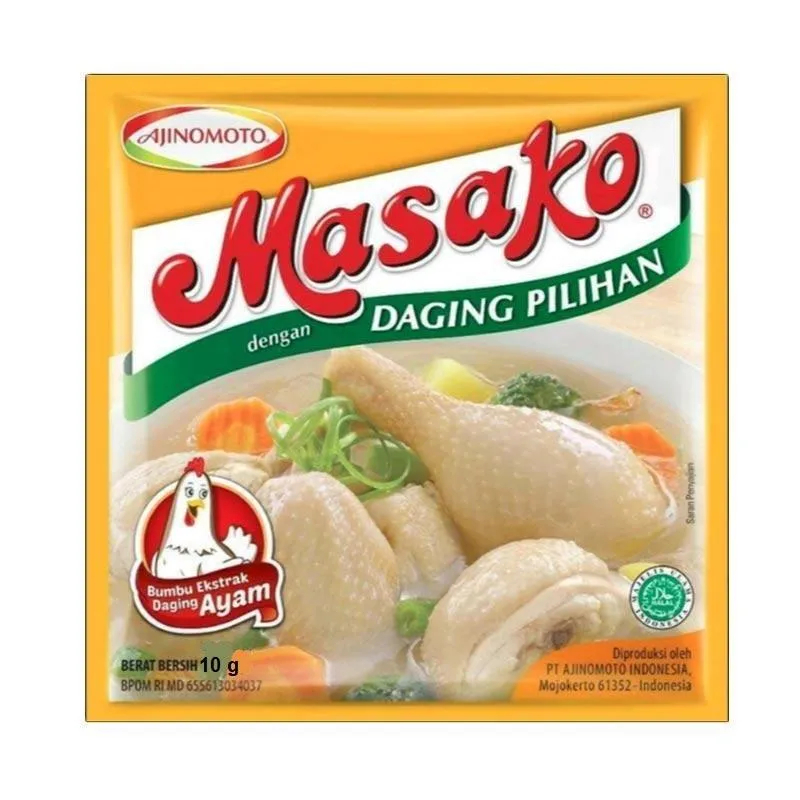 MASAKO Rasa Ayam Bumbu Penyedap Rasa [10g] merupakan bumbu penyedap rasa yang terbuat dari bahan pilihan & rempah-rempah alami untuk menghasilkan masakan dengan citarasa gurih & rasa yang mantap dengan cepat. Mudah terserap sehingga cocok untuk beragam hidangan berkuah, aneka tumisan, dan lain-lain.