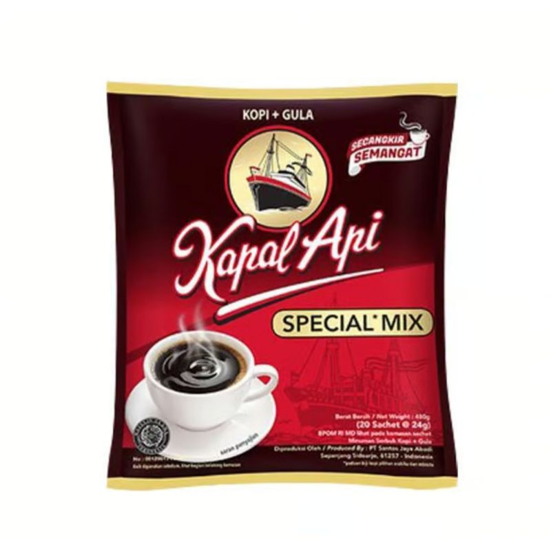 Kopi Kapal Api terbuat dari biji kopi pilihan dan diproses dengan mesin yang paling modern yang menghasilkan kopi berkualitas tinggi dengan Aroma terbaik dan Rasa yang enak. Kapal Api Special Mix Dibuat dari Biji kopi pilihan yang diolah dengan mesin yang paling modern dan campuran gula murni. Menjadikannya paduan spesial dari kopi dan gula. Kemasan Praktisnya, membuat kopi anda siap seduh dengan aroma kopi senikmat selera pilihan. Mulai hari Anda dengan secangkir semangat untuk Indonesia dengan Kopi Kapal Api