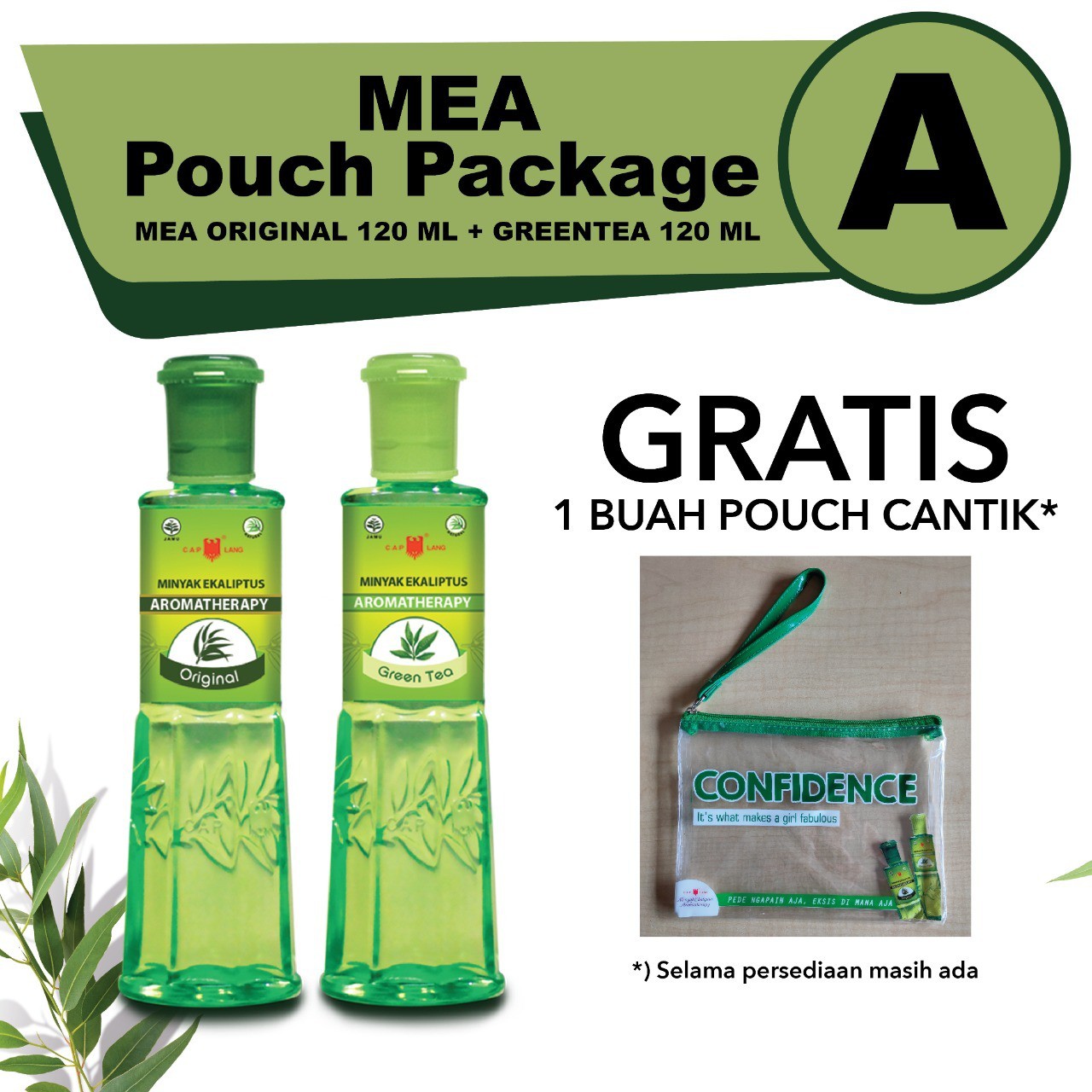 NOTE :#Produk di dalam paket adalah Cap Lang Minyak Ekaliptus Aromatherapy Original 120ml & Cap Lang Minyak Ekaliptus Aromatherapy Green Tea 120ml.Cap Lang Minyak Ekaliptus Aromatherapy merupakan minyak atsiri alami yang disuling dari tanaman Ekaliptus (Eucalyptus Globulus). Minyak Ekaliptus Aromatherapy mengandung Ekaliptus yang cukup tinggi dan merupakan zat alami berkhasiat serta bersifat multifungsi. Minyak Ekaliptus Aromatherapy memiliki tingkat kehangatan yang lebih tinggi dan juga tambahan aromatherapy yang bisa disesuaikan dengan kebutuhan.Kelebihan :HangatWangi aromatherapyHalalKualitas TerpercayaManfaat :Meredakan Perut Kembung / Mual.Gatal – gatal akibat gigitan serangga.
