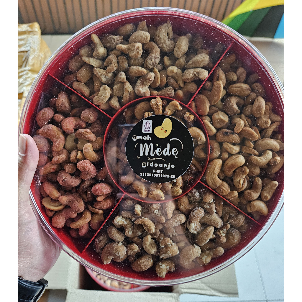 Produk ini dikemas dengan bublewrap dan kardus untuk memastikan produk tetap dalam kondisi yang baik saat sampai di tangan konsumen. Dengan kacang mete utuh sekat 5 varian 5rasa, konsumen dapat menikmati cemilan yang enak dan berkualitas dengan berbagai varian rasa yang berbeda.